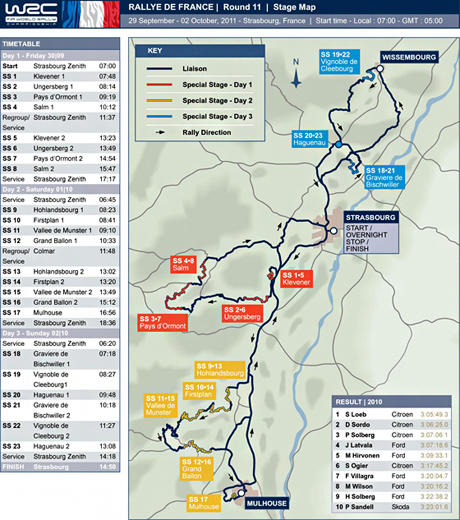 Scenariul se va repeta şi în acest an, când parcul de service este găzduit la Strasbourg, însă există câteva mici modificări. Cea mai lungă proba specială este Pays d’Ormont şi va avea loc în ziua de vineri pe un traseu cu lungimea de 36 de km, alături de alte trei probe care vor fi parcurse de două ori. Ziua de sâmbătă include două parcurgeri printr-o serie de trei probe speciale înainte de abordarea unui traseu complet nou în Mulhouse pe o distanţă de numai 3.09 km.