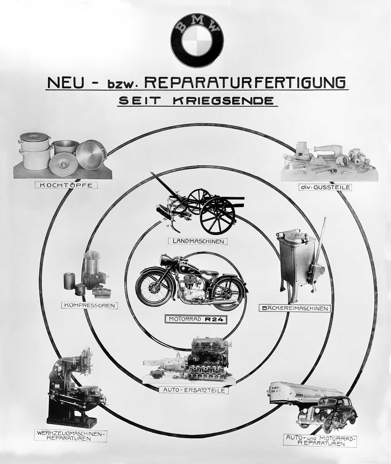 Între timp, BMW suferă teribil. Nu neapărat pentru că nu mai are linii de producție ci pentru că nu are voie să facă nimic. Nimic-nimic! Interdicția totală nu ține foarte mult, însă nici ridicarea sa nu deschide orizonturi foarte vaste: din 28 iulie 1945, BMW primește permisiunea să construiască bunuri de consum. Sigur, nici resursele nu erau chiar la discreție, așa că producătorul s-a orientat către produse pe care chiar poate să le facă. A numit această etapă „Producția de criză”. A început cu oale, apoi a progresat la alte produse de bucătărie, utilaje agricole, mașinării de frământat aluatul, compresoare de frână, materiale de construcții, biciclete. După opt luni de la ridicarea interdicției, americanii le dau voie celor de la BMW să construiască și motociclete, cu condiția să nu cumva să facă tancuri din ele. Ca-n bancul cu bilele, promit că vi-l spun altă dată.