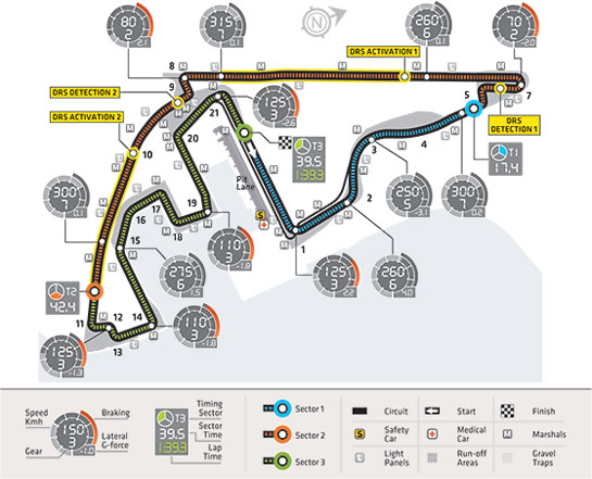 De aceea, FIA a decis să păstreze şi în acest an regulamentul cu două zone de detecţie şi activare pentru sistemul DRS. Prima zonă de activare pentru sistemul DRS a fost stabilită pentru mai mult de jumătate din linia drepta dintre virajele şapte şi opt, punctul de detecţie pentru diferenţa de maxim o secundă dintre doi piloţi urmând să fie cronometrată înainte de intrarea în virajul şapte. Imediat după ieşirea din virajul opt a fost stabilită a doua zonă de detecţie, iar sistemul DRS va putea fi activat pentru a doua oară pe aproximativ jumătate din distanţa dintre virajele nouă şi 10.