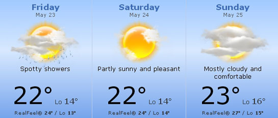 Piloţii vor avea parte de o vreme predominant frumoasă la Monaco la sfârşitul acestei săptămâni. Totuşi, Marele Premiu va debuta joi sub spectrul unor furtuni, însă nu este clar dacă acestea vor afecta antrenamentele. În schimb, sâmbăta şi duminica vremea se anunţă mult mai bună, cu temperaturi maxime de 22-23 grade şi câţiva nori pe cer, însă şansele de ploaie sunt infime.