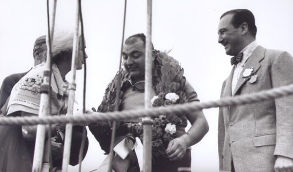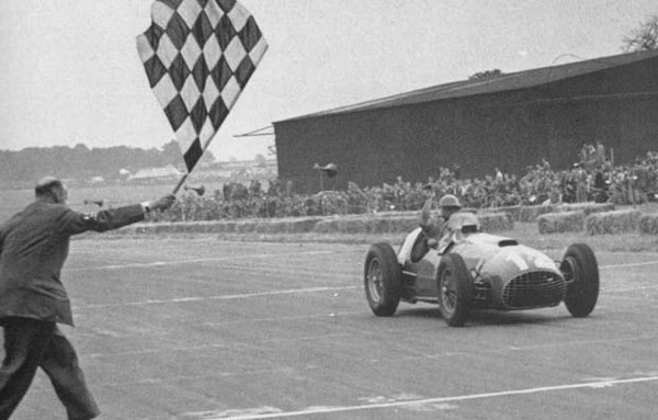 Momentul in care Gonzalez trece linia de sosire la Silverstone in 1951.