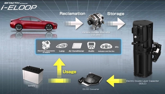 Sistemul i-Eloop de la Mazda recuperează energia cinetică pierdută în mod normal la frânare din momentul în care şoferul eliberează pedala de acceleraţie. Energia cinetică recuperată este transformată în energie electrică şi stocată în condensatorul menţionat mai sus. Echipamentele electrice de la bord sunt alimentate de la respectivul condensator, reducând sarcina la care este supus alternatorul, ceea ce reduce şi consumul de carburant.