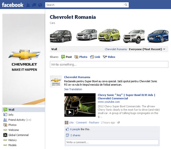 Chevrolet s-a alăturat anul trecut în toamnă importatorilor din România reprezentaţi pe Facebook. A crescut până peste 4.000 de fani şi este actualizată zilnic. Au existat şi concursuri cu premii şi se interacţionează constant cu clienţii şi cu cei care au avut întrebări sau curiozităţi vizavi de marca americană.