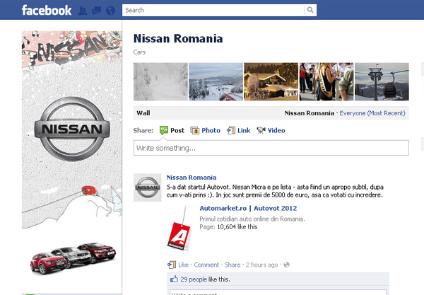 Nissan România are pagina de Facebook cu cea mai rapidă creştere a numărului de fani. Nissan s-a alăturat Facebook-ului îpe 5 decembrie 2011 şi a ajuns extrem de rapid la peste 25.000 de fani.