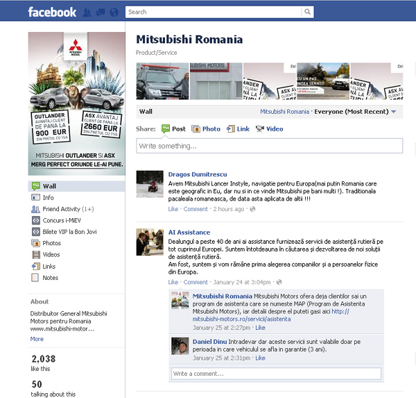 Începem cu Mitsubishi. Marca japoneză are mulţi fani în România, dar pe Facebook a venit relativ târziu. Chiar și așa, a strâns peste 2.000 de fani, restul paginilor fiind sub această cifră și chiar sub o mie de like-uri Pagina este administrată de M Car, importatorul şi distribuitorul modelelor Mitsubishi în România. Aici sunt prezentate ofertele speciale, iar clienţii interacţionează direct cu reprezentanţii mărcii.