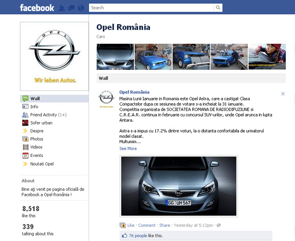 Mărcile germane sunt bine văzute în România şi acest lucru nu este un secret. Opel a venit pe Facebook anul trecut şi de atunci a crescut constant în ceea ce priveşte numărul de like-uri. Pagina are concursuri, informaţii şi multe fotografii pentru fanii mărcii.