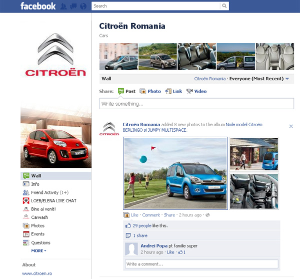 Citroen este primul importator pe podiumul paginilor de Facebook ale importatorilor auto din România. Citroen a investit mult la capitoul comunicare de când a venit în România cu reprezentanţă directă. Marca franceză a devenit foarte vizibilă la noi în ţară şi nu putea neglija şi comunităţile virtuale de socializare. Pagina Citroen România este extrem de activă şi fanii sunt atraşi constat cu concursuri cu premii.