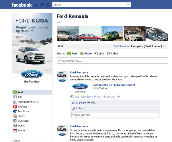Ford România este pe locul nouă cu peste 8.000 de fani în comunitatea virtuală. Cei care urmăresc pagina au parte de informaţii despre Ford şi activităţile din România. Acest lucru va devenii din ce în ce mai interesat odată cu lansarea producţiei de modele Ford la Craiova.