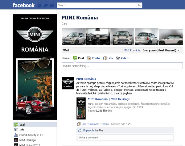 Partea simpatică a importatorului BMW România este marca Mini. O marcă puternică şi foarte bine văzută la noi în ţară. Mini a adunat peste 6.000 de fani pe pagina de facebook. Pagina este excelent structurată şi beneficiază de actualizări constante şi alte interacţiuni.