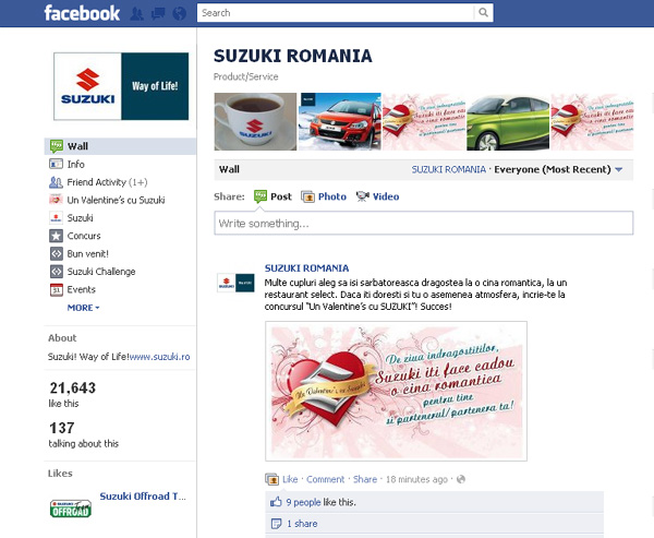 Surpinzător, importatorul autohton Suzuki este extrem de activ pe Facebook. Fanii mărcii japoneze au parte de numeroase concursuri şi multe alte interacţiuni.
