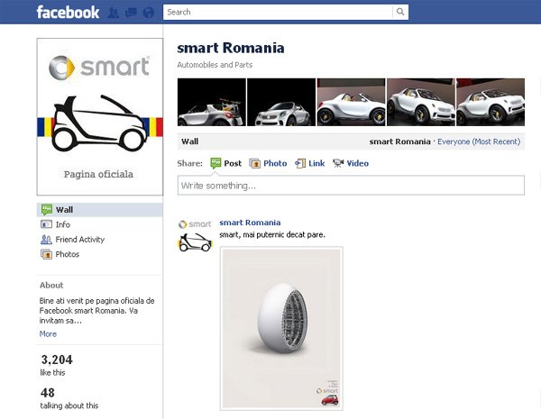 Parte din grupul Daimler, marca Smart are mulţi fani şi în ţara noastră. o dovedeşte şi pagina de Facebook a reprezentanţei din România. Ca şi în cazul mărcii Mercedes-Benz, importatorul a delegat serviciile de comunicare către o agenţie de PR care se ocupă inclusiv de paginile de Facebook ale celor două mărci.