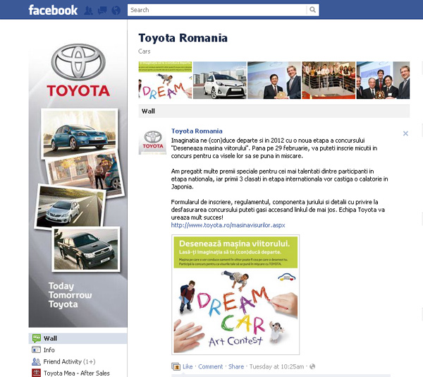 Comunitatea Toyota este una dintre cele mai mari. Clienţii mărcii japoneze sunt fideli şi pagina de Facebook a fost creată exact în stilul conservator al mărcii.