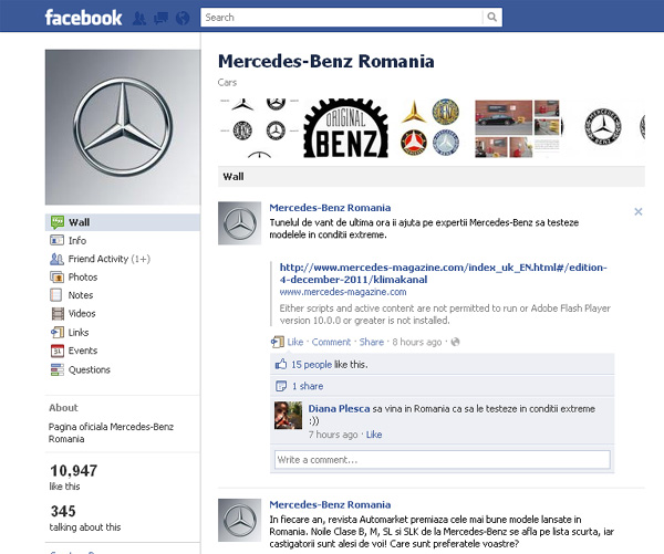 Prima marcă din România cu peste 10.000 de like-uri este Mercedes-Benz. Pagina autohtonă a mărcii din Stuttgart este actualizată constant, dar avea nevoie de ceva mai multă culoare şi mai multă interacţiune cu fanii mărcii.