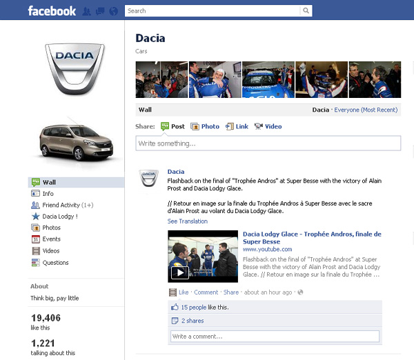 Dacia nu are o pagină de Facebook dedicată pieţei româneşti, dar are o pagină internaţională unde postările se fac în limba engleză. Are aproape 20.000 de fani care pot afla informaţii despre modelele Dacia şi despre implicarea mărcii în Trofeul Andros, competiţia auto pe circuite de gheaţă. Dacia mai are în schimbi pagini satelit create pentru diverse evenimente sau de fanii mărcii.