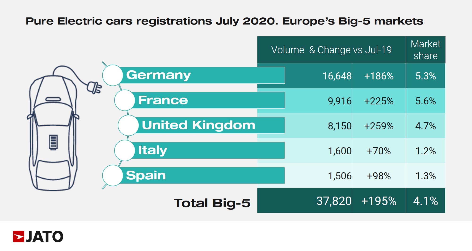 Franța se laudă cu o creștere de 225%, la 9.916 unități și o cotă de piață superioară, de 5.6%. În schimb, Germania a raportat o creștere de 186%, însă are și cel mai mare număr de mașini electrice vândute dintre cele 5 țări incluse în analiză: 16.648 de unități. În Germania, care este și cea mai mare piața auto europeană, cota de piață a electricelor a ajuns la 5.3%.